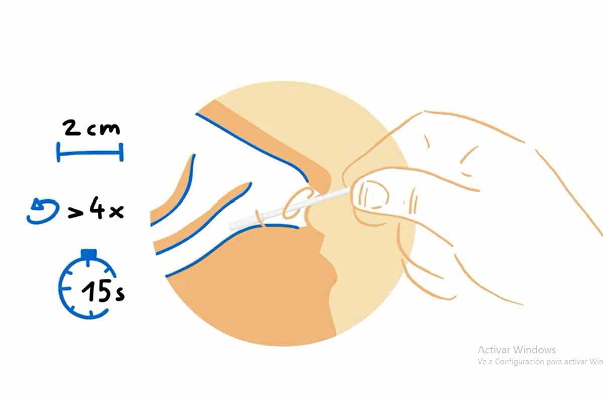 La persona inclinará la cabeza hacia atrás, insertará la torunda con la almohadilla suave hacia adelante en la fosa nasal izquierda, deslizará dos centímetros en paralelo al paladar, no hacia arriba, hasta encontrar resistencia.