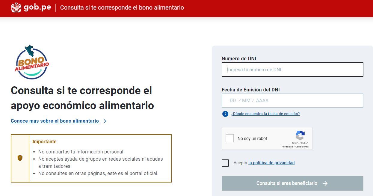 La entidad habilitó este lunes la línea gratuita 101 y la página web bonoalimentario.gob.pe para conocer quiénes serán los beneficiarios. Las cuatro modalidades de pago del bono, que busca aliviar el incremento de precios de productos de la canasta básica, son: Depósito en cuenta, billetera digital, carritos pagadores y pago en agencias bancarias.