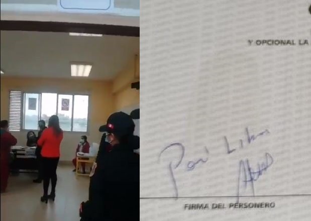 Según fuentes de la Policía Nacional, la intervenida había escrito “P.L.” y “Perú Libre” en 256 cédulas de sufragio que se entregan a los electores, y las había firmado.