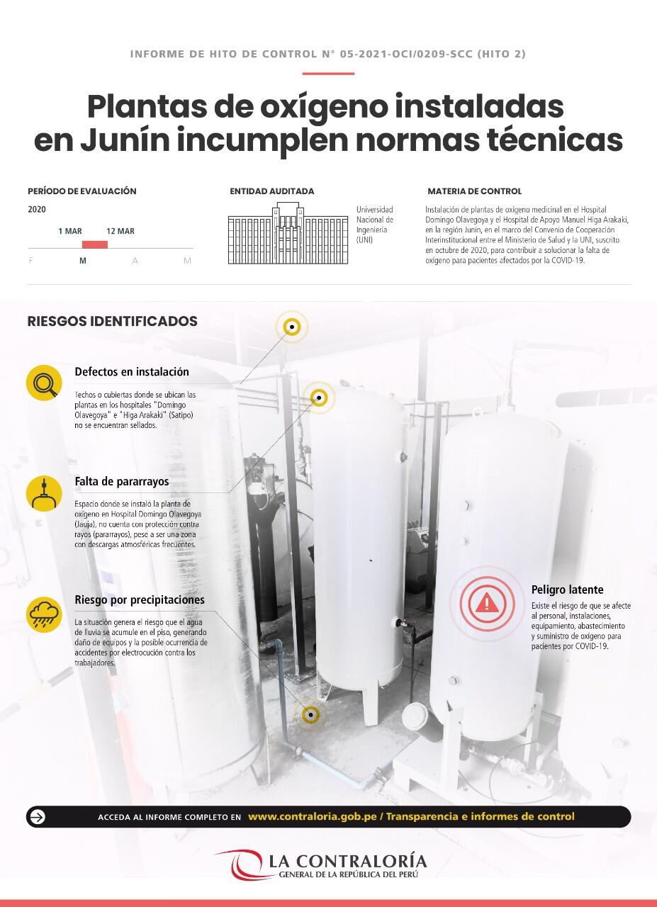 Según el Informe de Hito de Control N° 05-2021-OCI/0209-SCC (Hito N° 2) ejecutado entre el 1 al 12 de marzo de 2021, la Contraloría verificó la etapa de instalación y acondicionamiento técnico mínimo, para lo cual realizó una visita de inspección a cuatro hospitales donde han sido instaladas las plantas de oxígeno, observando que en el Hospital Domingo Olavegoya y el Hospital de Apoyo Manuel Angel Higa Arakaki, ambos en Junín, existen riesgos que podrían afectar la finalidad pública de dichas instalaciones.