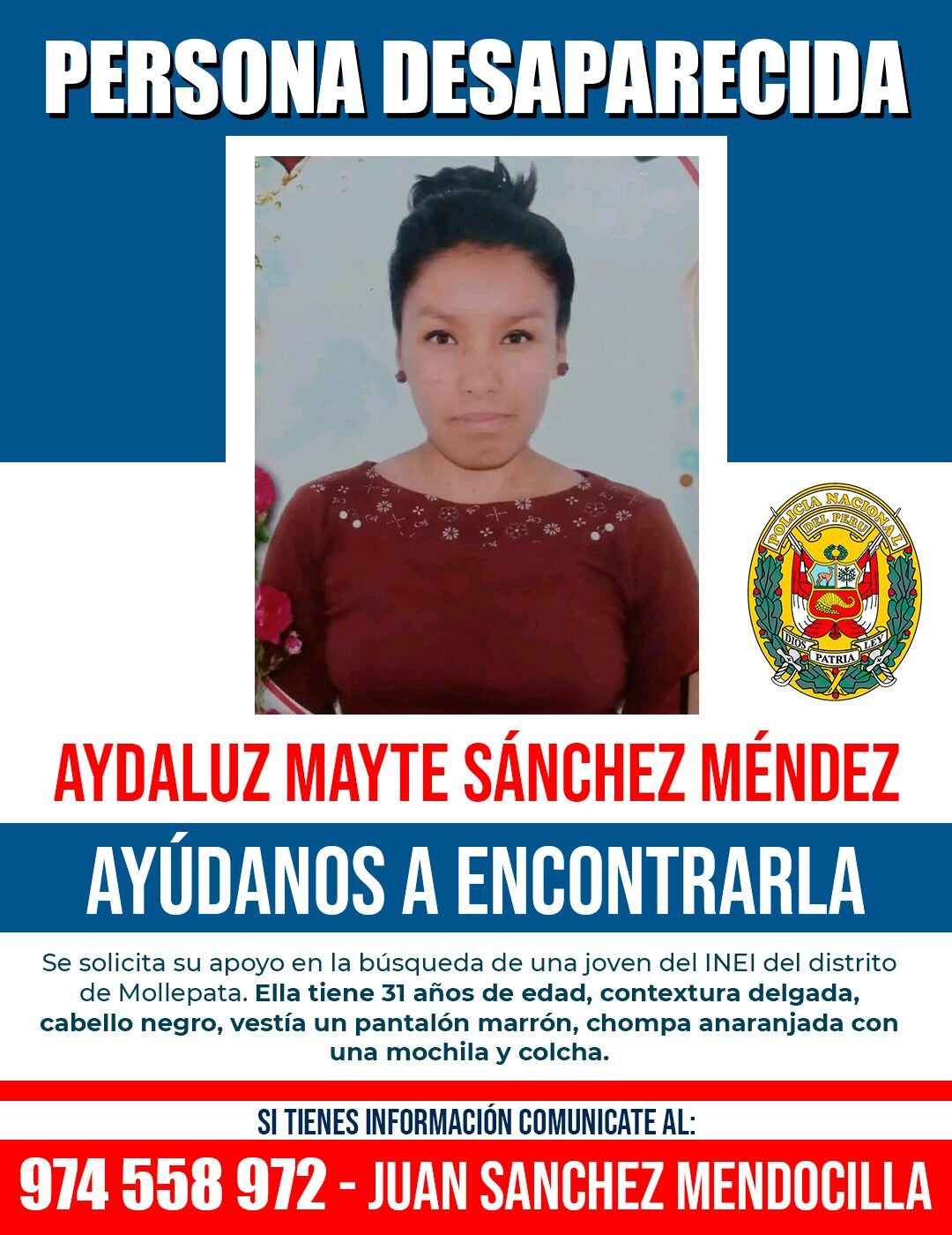 Cuatro días de zozobra y búsquedas a pie, en moto y hasta con drones tuvieron en vilo a todo Mollepata. La joven censista Aydaluz Mayté Sánchez Méndez (31), que el jueves 7 de agosto salió temprano para cumplir con el Censo Nacional 2025, desapareció sin dejar rastro… hasta que la noche del domingo fue hallada con vida en Trujillo, para alivio de su familia y de todo el equipo que se había movilizado para encontrarla.