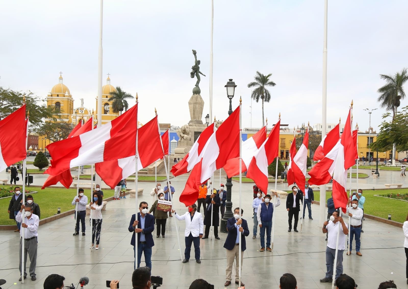 En la plaza de armas de la ciudad de Trujillo, en la región La Libertad, se llevó a cabo un “banderazo” encabezado por el gobernador regional, Manuel Llempén, quien con el respaldo de alcaldes, consejeros regionales y representantes gremiales del sector salud, exigió al Gobierno Central la presencia del primer ministro, Walter Martos, y de la titular del Ministerio de Salud (Minsa), Pilar Mazzetti.