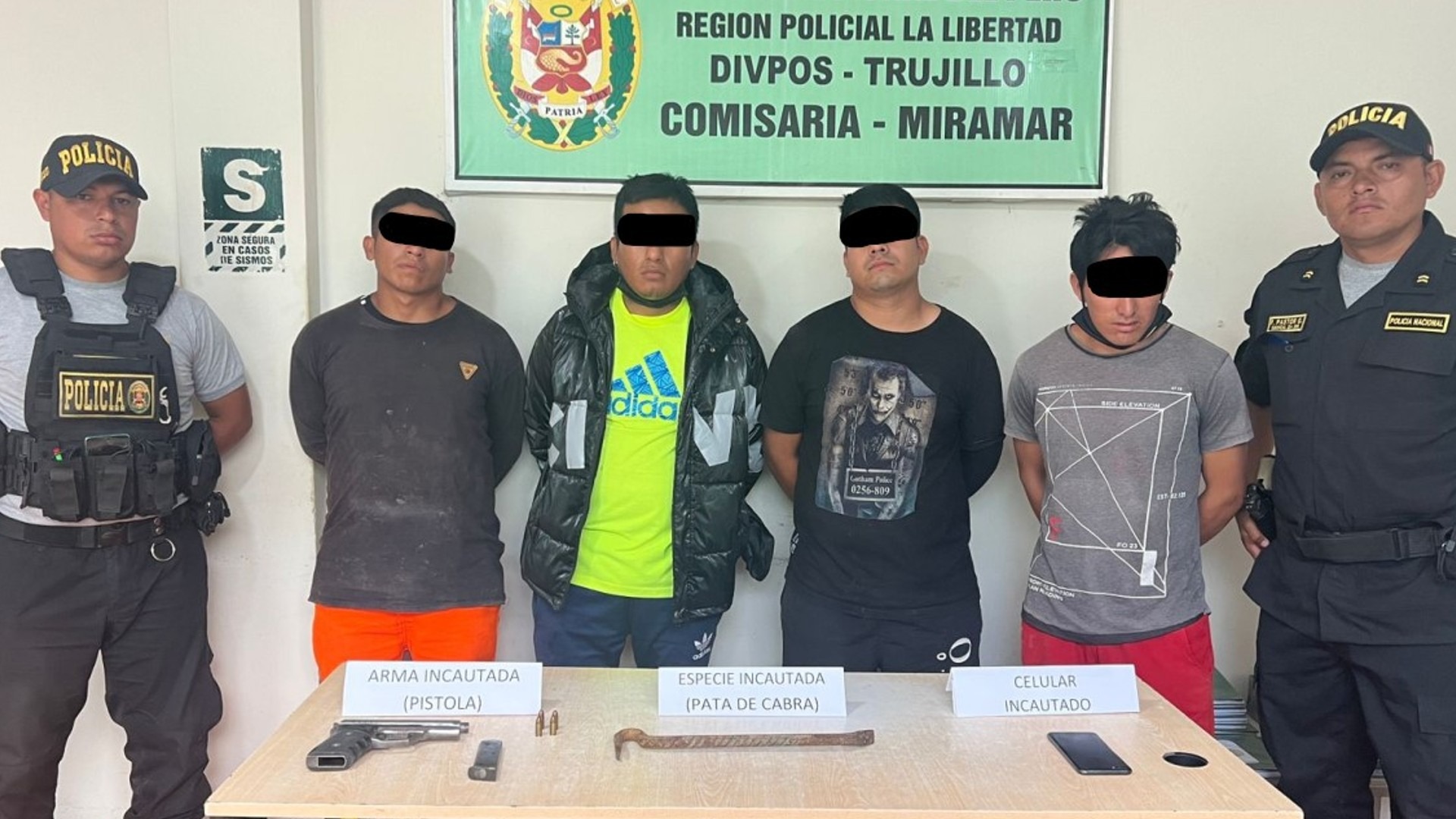 Agentes de la comisaría de Miramar detuvieron a cuatro presuntos integrantes de una banda de ‘marcas’ cuando seguía el automóvil de su próxima víctima, en la ciudad de Trujillo, en La Libertad. En poder de los intervenidos se les halló un ama de fuego, un celular reportado como robado y una pata de cabra (fierro) que empleaban para amedrentar a sus víctimas.