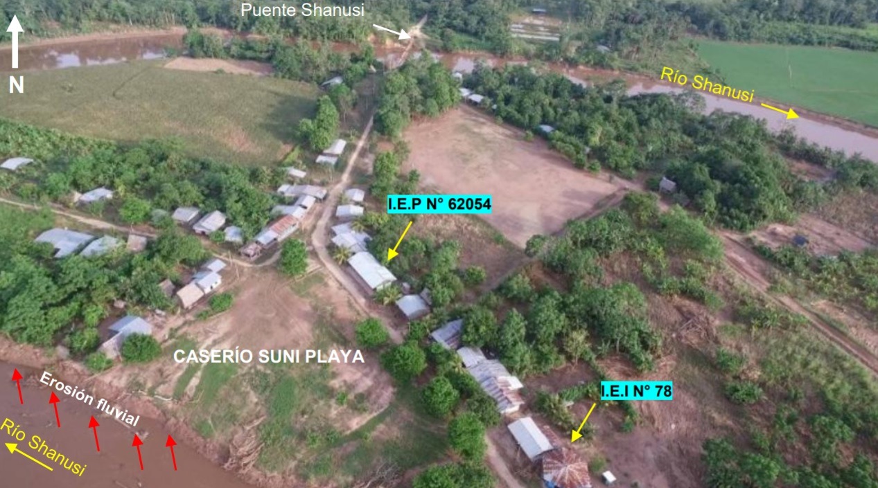 “Se muestra el proceso erosivo del río Shanusi, que avanza hacia el extremo sur del caserío, evidenciando pérdidas de terrenos de aproximadamente una hectárea por año”, indicó la institución.