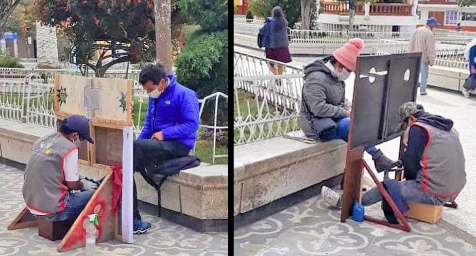 Unos lustrabotas de Bambambarca (Cajamarca) reiniciaron sus labores con su tradicional cajón de utensilios pero esta vez agregaron un escudo protector de madera, a fin de mantener el distanciamiento social por COVID-19 al momento de bolear los zapatos del cliente.