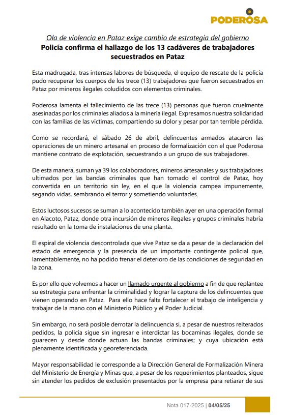 “Poderosa lamenta el fallecimiento de las trece personas que fueron cruelmente asesinadas por los criminales aliados a la minería ilegal. Expresamos nuestra solidaridad con las familias de las víctimas, compartiendo su dolor y pesar por tan terrible pérdida”, se lee en el documento.