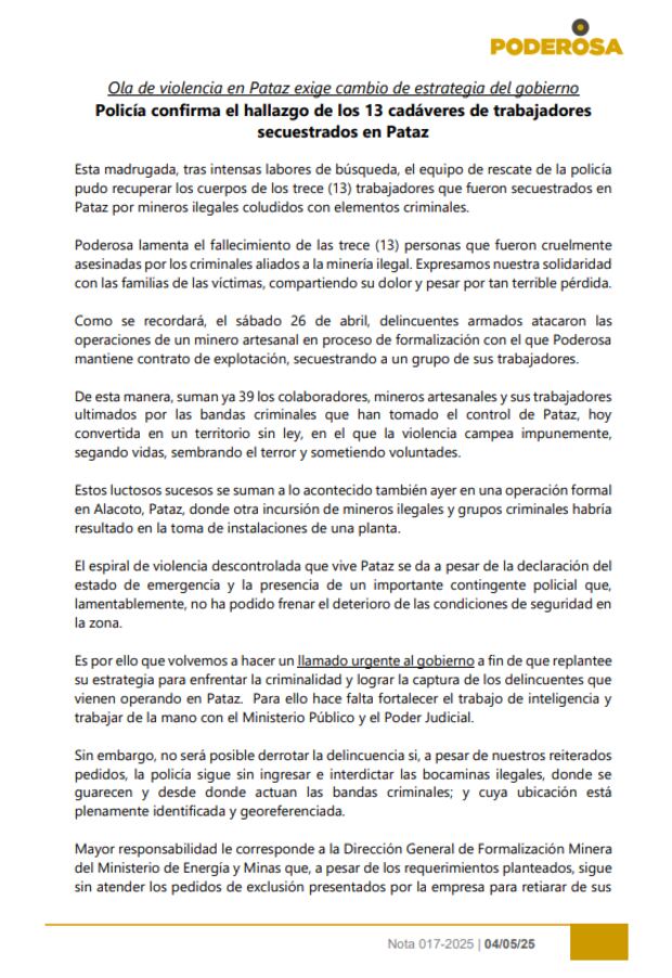 ¡SE PRONUNCIA! La minera Poderosa emitió un comunicado tras la confirmación del hallazgo de 13 trabajadores asesinados por mineros ilegales en Pataz, La Libertad, y que previamente habían sido secuestrados.