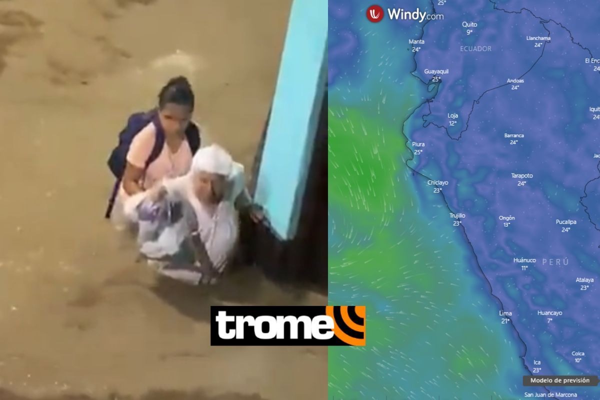 DRAMA EN PACASMAYO. Una anciana no tuvo otra alternativa que abandonar su vivienda inundada por las lluvias que cayeron sobre Pacasmayo, en La Libertad. La mujer salió de noche asistida por su familia para huir del agua que se metió en su vivienda tras varias horas de intensas precipitaciones que soportó su localidad.