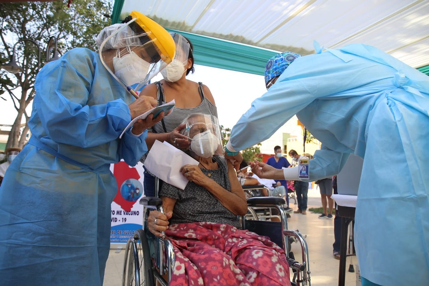 La señora Elsa Olaya Farfán de 91 años, natural de la provincia de Sullana, en Piura, fue la primera adulta mayor en ser inmunizada contra el coronavirus. Esta jornada se desarrolló el último sábado en dicha localidad del norte del país.