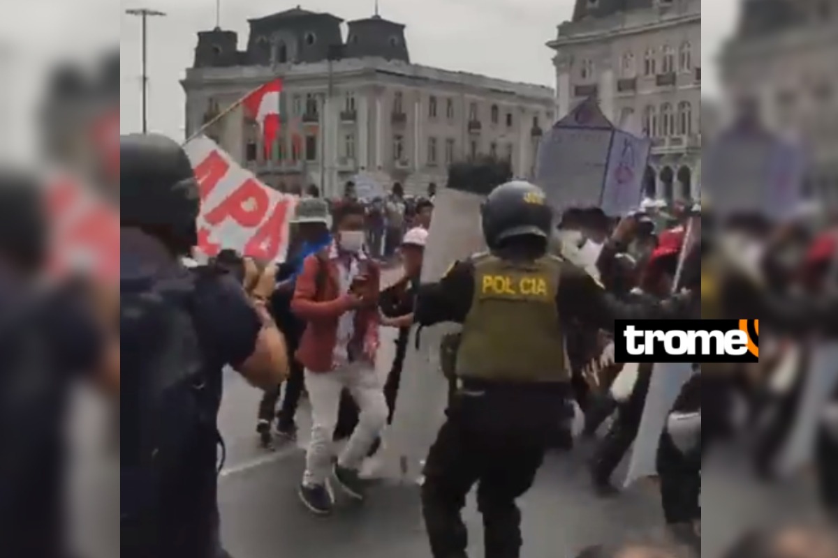 Tras ello, varios manifestantes reclamaron de manera iracunda, ante lo cual inició una fuerte represión policial a punta de gases lacrimóngenos. Así, como se aprecian en imágenes difundidas en redes sociales, inclusive hay agentes que intenta dar una patada en el estómago a una mujer protestante. Esta tensa situación provocó que los enfrentamientos inicien entre ambas partes.