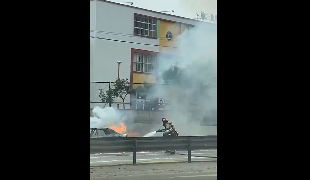 Tres unidades del Cuerpo General de Bomberos Voluntarios del Perú atienden el incendio de un vehículo en plena Vía Expresa de la Av. Paseo de la República, a la altura del Colegio Alfonso Ugarte, en el distrito de San Isidro.
