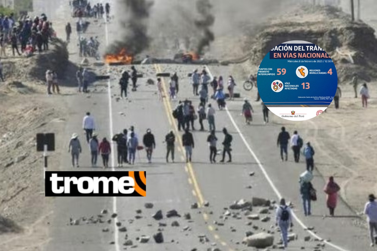 Según la última actualización del miércoles 8 de febrero hasta las 12:30 p.m., se determinó que el tránsito se encuentra interrumpido en cuatro regiones y afecta a 13 vías nacionales.