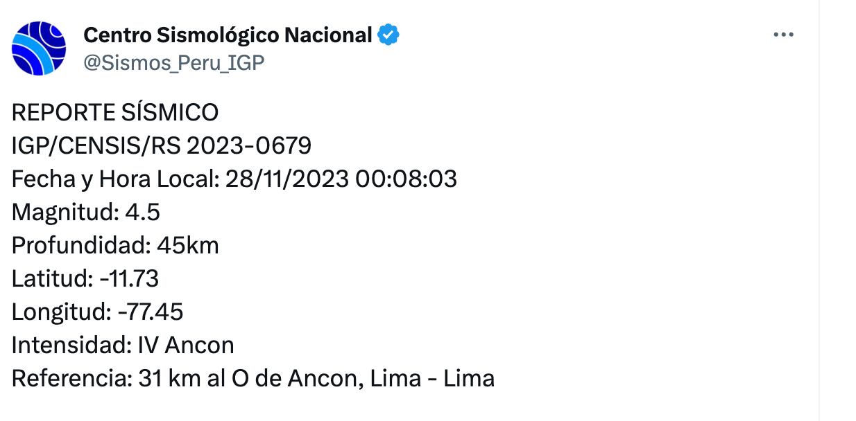 Asimismo, se detalló que el sismo tuvo una profundidad de 45 km, latitud, -11.73 y longitud -77.45. Hasta el momento, no se han reportado daños materiales ni heridos.