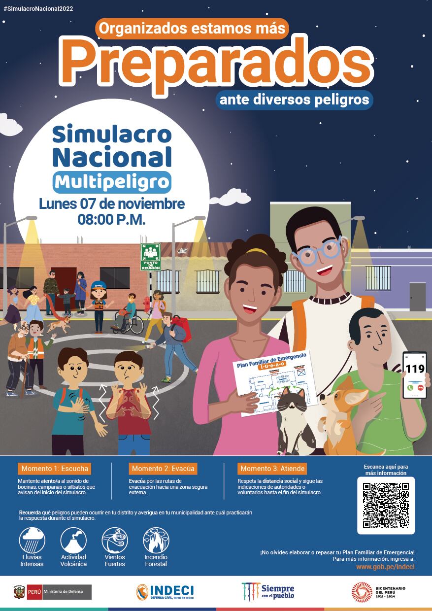 “Organizados estamos más preparados” es el lema del Tercer Simulacro Nacional Multipeligro, programado por el Instituto Nacional de Defensa Civil (Indeci) para este lunes 7 de noviembre desde las 8:00 de la noche, siendo el último del año de acuerdo a lo dispuesto en la Resolución Ministerial 013-2022-PCM.