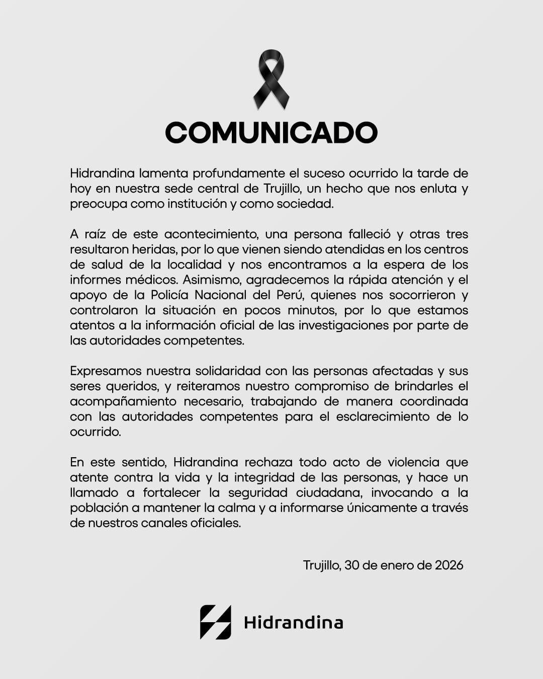 La empresa Hidrandina emitió un comunicado y lamentó lo sucedido la tarde de ayer en su sede de Trujillo