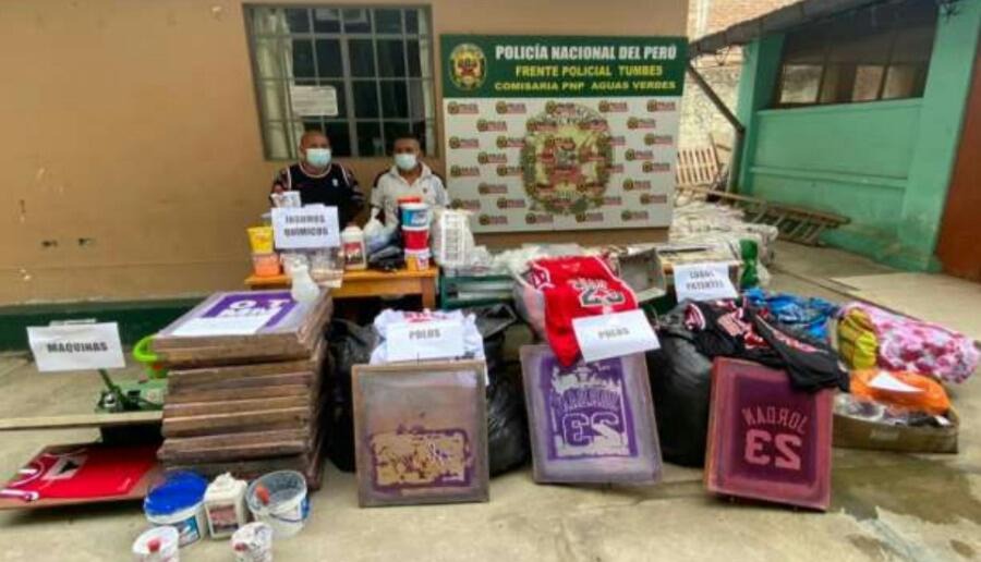 Efectivos de la Policía Nacional del Perú (PNP) intervinieron a dos presuntos integrantes de una banda criminal dedicada a fabricar réplicas de polos de reconocidas marcas internacionales, en el distrito de Aguas Verdes, pertenecientes a la provincia de Zarumilla (Tumbes).