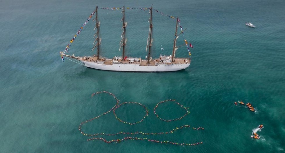 Por el Bicentenario de la Marina de Guerra del Perú, más de 400 nadadores formaron con sus cuerpos el número 200 en el mar frente al Buque Escuela a Vela BAP Unión y este sábado 351 nadadores de alto rendimiento, amateur y cadetes participarán en el campeonato bicentenario de aguas abiertas La Ruta de Grau.