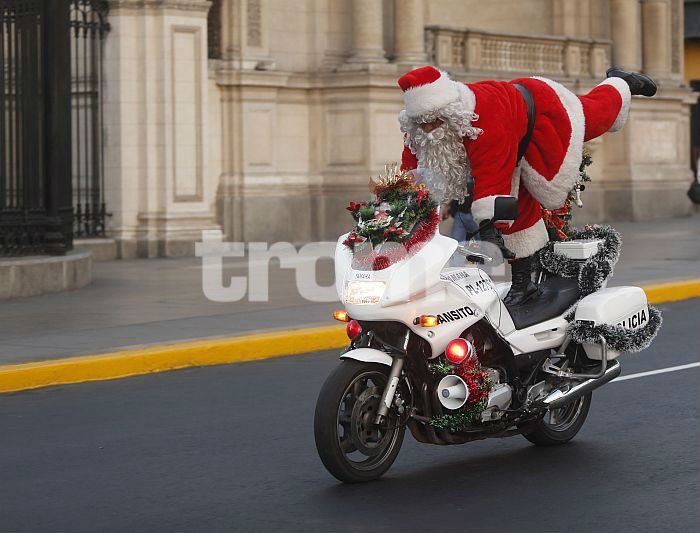 Trome ubicó a este Policía Papá Noel motorizado en la Plaza de Armas de Lima, donde fue el centro de atención de transeúntes y conductores. Inclusive los turistas se tomaban ‘selfies’ con él y las 'policías Noelas' que lo acompañaban. Sus acrobáticas maniobras de exhibición cautivaron a todos.