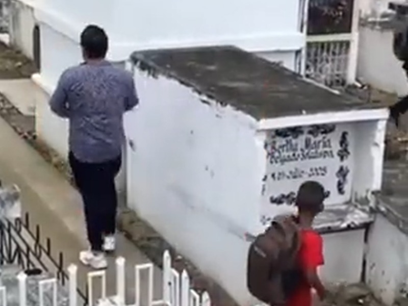 Las imágenes subidas a la red social TikTok muestran al pequeño, que viste de forma humilde con plo rojo, pantalón crema, zapatillas negras y que lleva una mochila, buscando el lugar de descanso de su madre. Él lleva un ramo de flores en la mano.