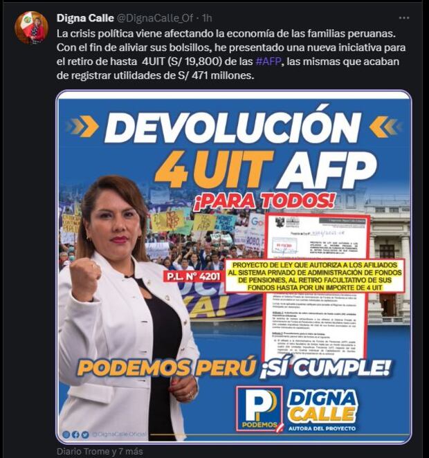 La legisladora Digna Calle, de la bancada parlamentaria Podemos, fue más allá con una iniciativa que permite a los ciudadanos afiliados a las AFP retirar de hasta 4 UIT (S/ 19,800) de sus fondos pensionarios.