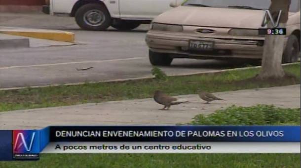Varias palomas aparecieron muertas en un parque ubicado a pocos metros del colegio San Martín de Porres, en el distrito de Los Olivos. Algunos vecinos consideran que las aves habrían sido envenenadas por desconocidos. Según comentaron, algunas palomas cayeron después de alzar vuelo y otras se desplomaban al estar caminando.