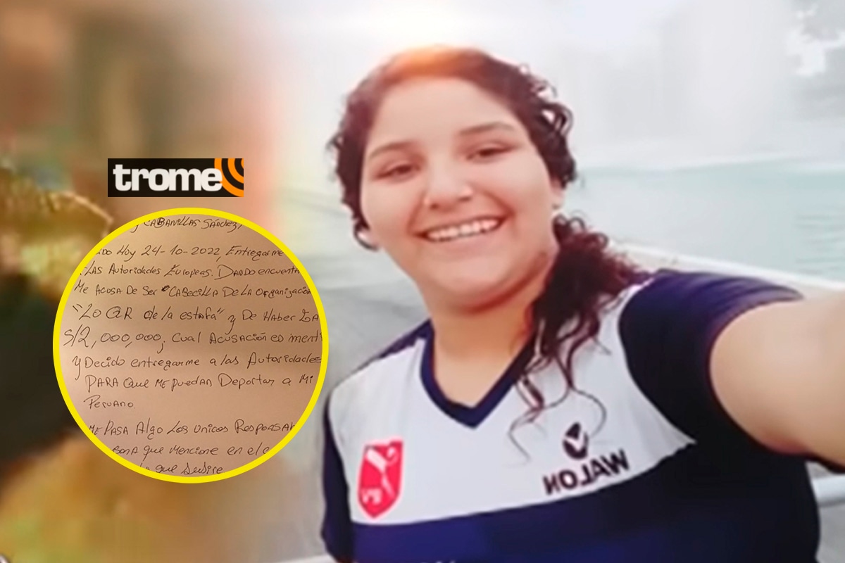 “Yo, Pamela Cabanillas, decido hoy 24-10-2022, entregarme voluntariamente a las autoridades europeas dando cuenta que se me acusa de ser cabecilla de la organización criminal ‘Los GR de la estafa’y de haber ganado 2 millones de soles, cual acusación es mentira y decido entregarme a las autoridades europeas para que me puedan deportar a mi país peruano”, se lee en el documento que publicó la estafadora.