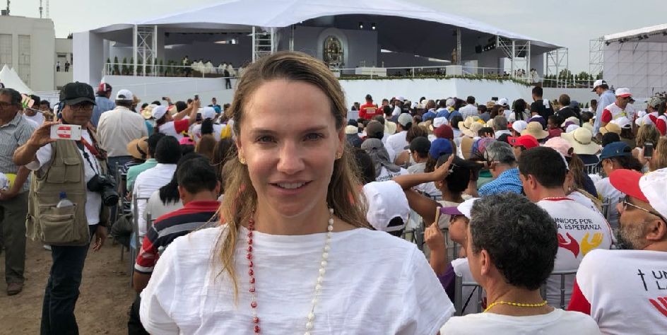 En Las Palmas encontramos sudando a chorros a la siempre guapa Luciana León, quien escuchó la misa del Papa Francisco. Estaba con un polo blanco y un rosario bicolor colgaba de su cuello...