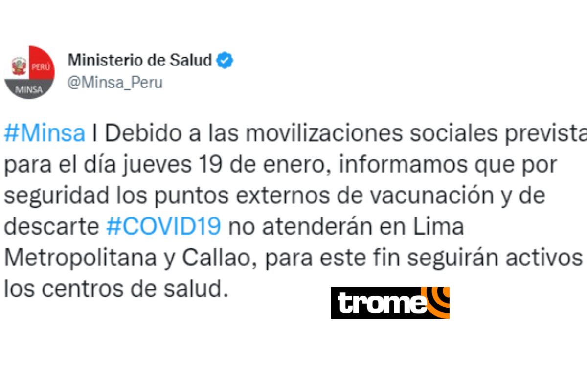 “Debido a las movilizaciones sociales previstas para el día jueves 19 de enero, informamos que por seguridad los puntos externos de vacunación y de descarte COVID-19 no entenderá en Lima Metropolitana y Callao”, informó la entidad.
