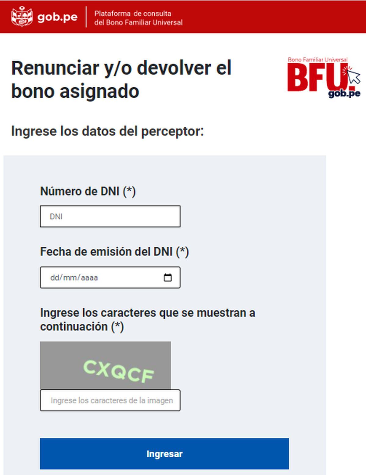 Si tu hogar fue incluido en la lista de beneficiarios del bono, pero quieres renunciar a él y/o devolverlo de forma voluntaria, puedes indicarlo para que el Estado lo asigne a otra familia que realmente lo necesita.