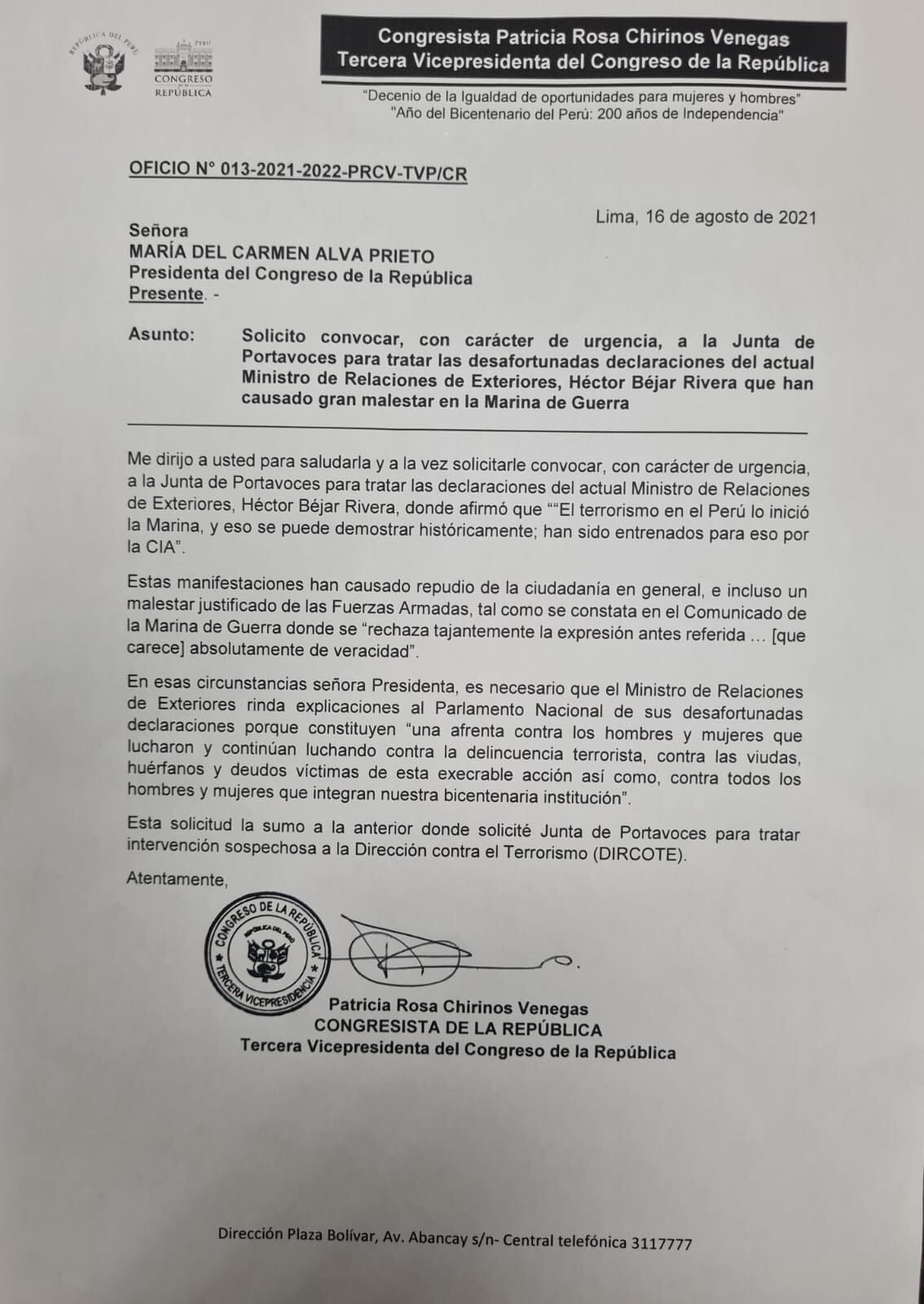 La tercera vicepresidenta del Congreso, Patricia Chirinos (Avanza País), pidió a la titular del Parlamento, María del Carmen Alva, que convoque con carácter de urgencia a una Junta de Portavoces, a fin de abordar las declaraciones hechas por el ministro de Relaciones Exteriores, Héctor Béjar, sobre el terrorismo en el Perú.