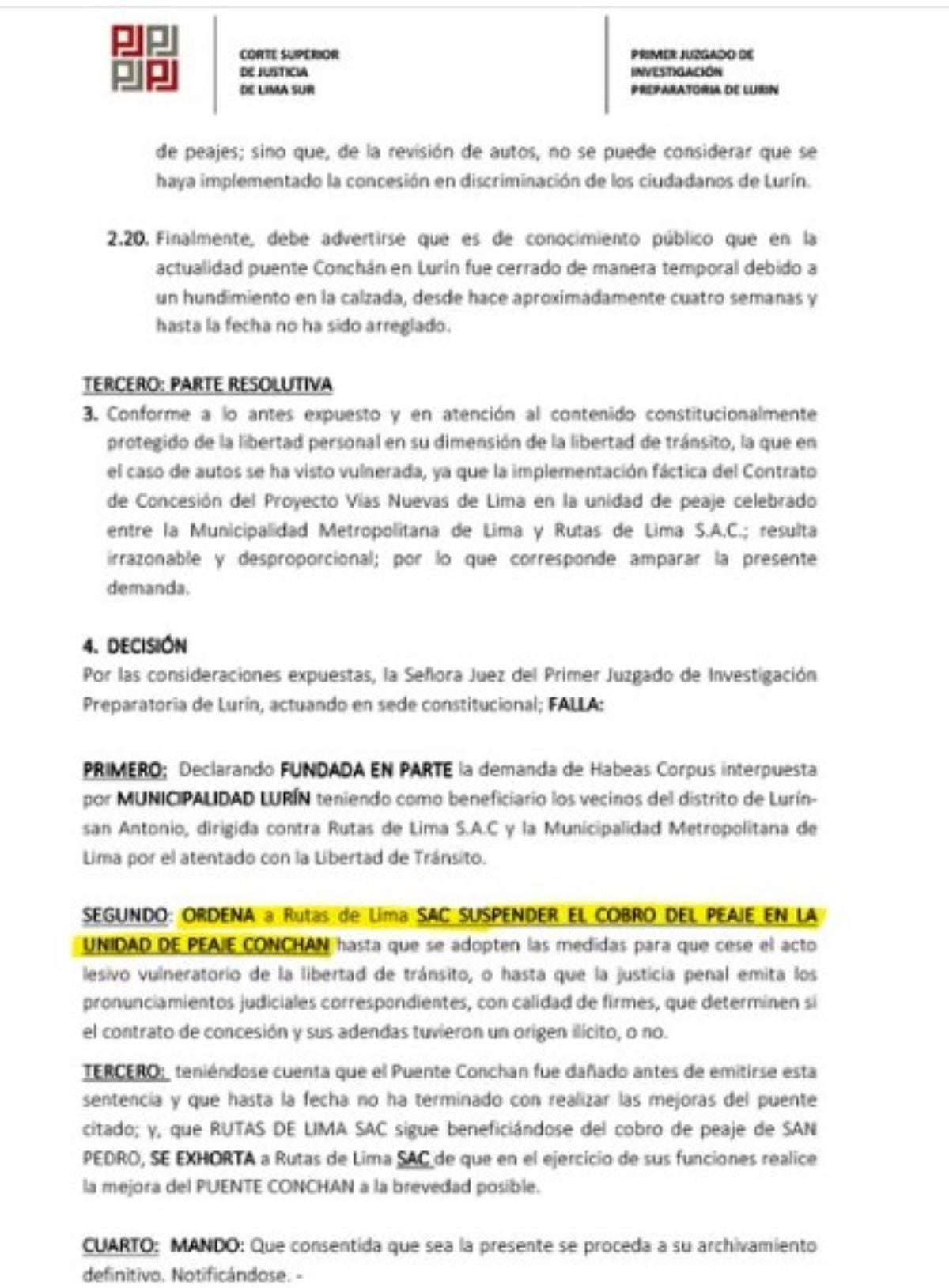 La sentencia fue emitida por el Primer Juzgado de Investigación Preparatoria de Lurín y señala que el cobro vulneraba el derecho al libre tránsito, ya que obligaba a los ciudadanos a tomar rutas alternas inadecuadas que incrementaban significativamente su tiempo de desplazamiento.