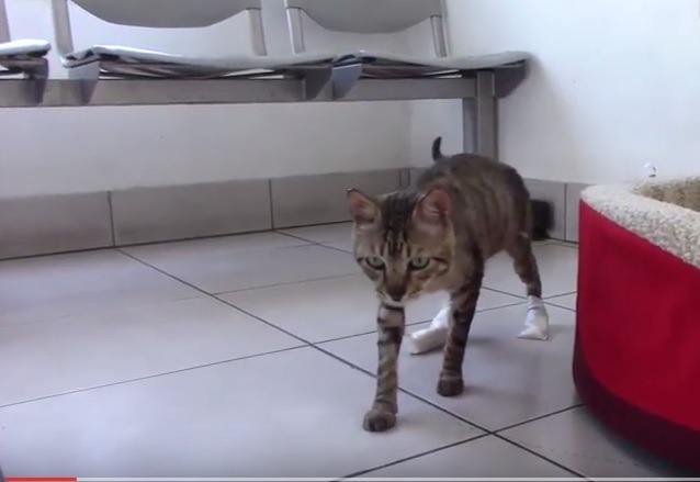 Agregó que el minino aún tiene sus patitas traseras vendadas y le falta recuperar peso, pero evoluciona bien, tiene mejor ánimo y ya mueve sus patitas para jugar. "En un mes podrá ser devuelto a su familia”, manifestó Ospina.