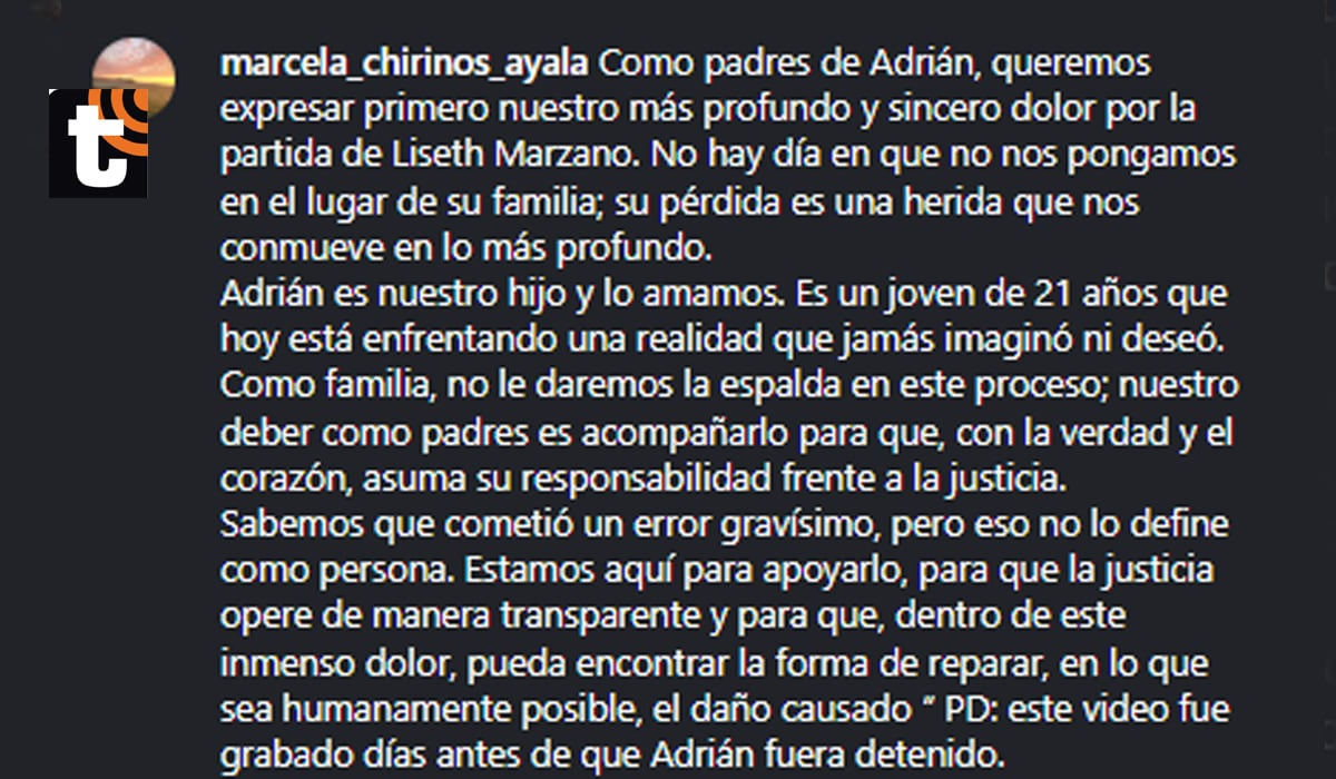 “Adrián es nuestro hijo y lo amamos. Es un joven de 21 años que hoy está enfrentando una realidad que jamás imaginó ni deseó. Como familia, no le daremos la espalda en este proceso; nuestro deber como padres es acompañarlo para que, con la verdad y el corazón, asuma su responsabilidad frente a la justicia”, escribió.