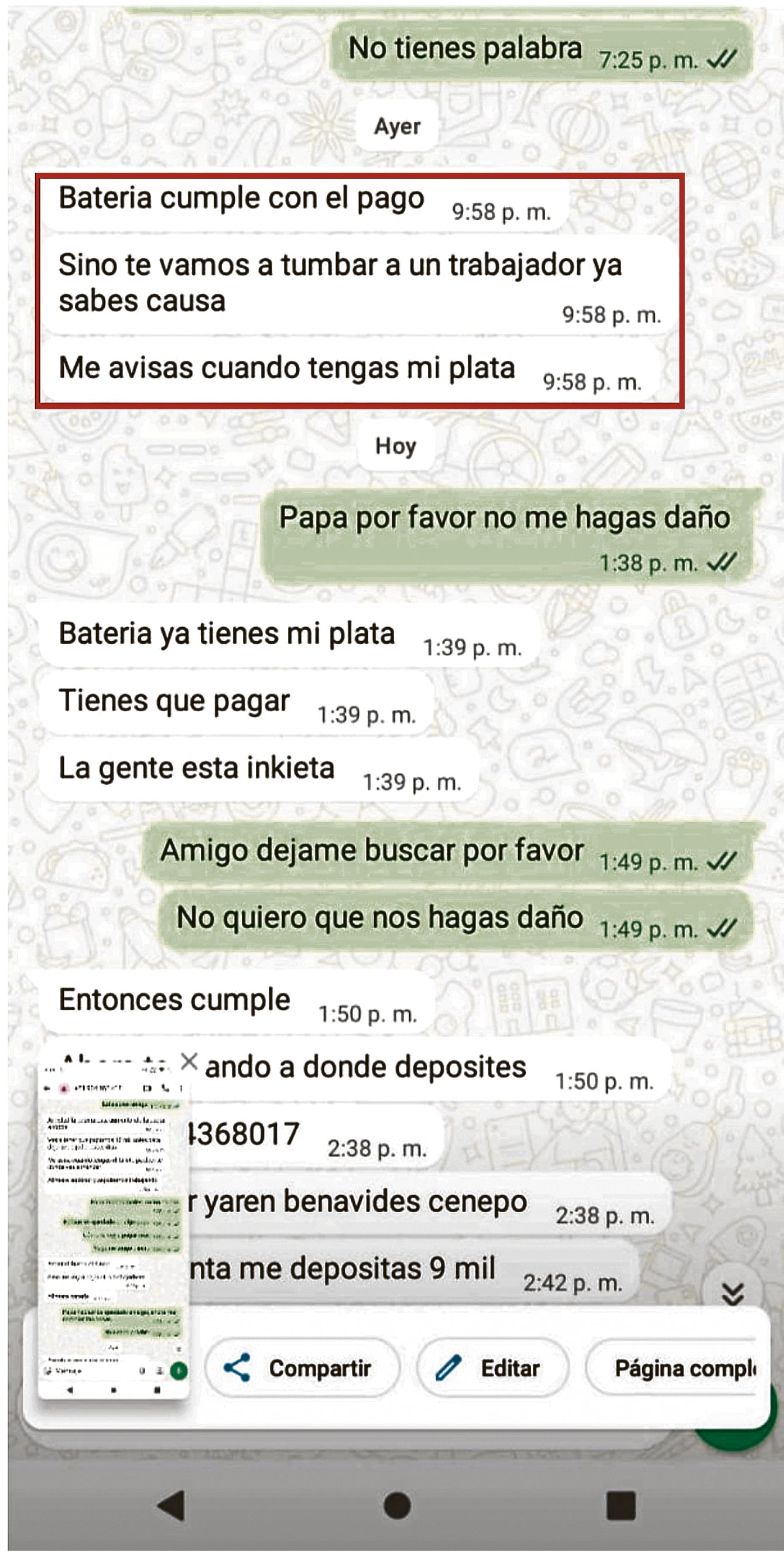 “Vas a tener que pagarnos 10 mil soles para dejarte de joder estos días... busca el dinero o me voy a bajar a tus trabajadores”, es uno de los tantos mensajes extorsivos.