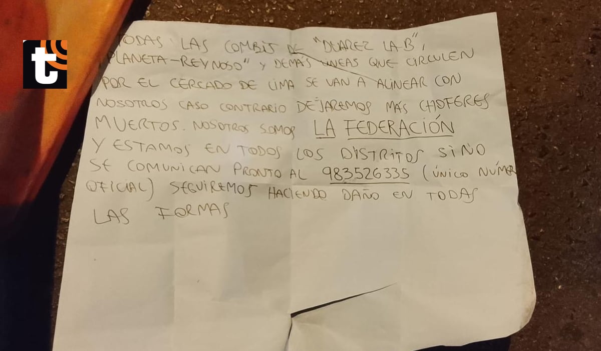 En el lugar del crimen, los sicarios dejaron un mensaje escrito dirigido a los transportistas de la Línea B y a otras empresas que operan en esta jurisdicción del Cercado de Lima.