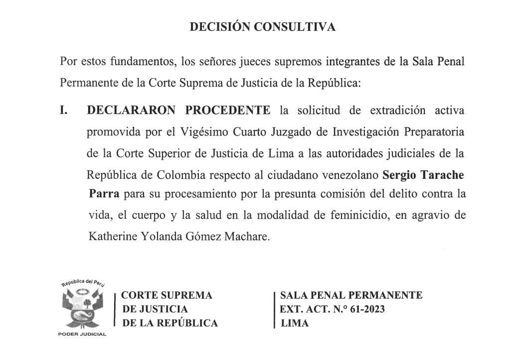 “Declararon procedente la solicitud de extradición activa promovida por el Vigésimo Cuarto Juzgado de Investigación Preparatoria de la Corte Superior de Justicia de Lima a las autoridades judiciales de la República de Colombia respecto al ciudadano venezolano Sergio Tarache Parra para su procesamiento por la presunta comisión del delito contra la vida, el cuerpo y la salud en la modalidad de feminicidio, en agravio de Katherine Yolanda Gómez Machare”, indicó la Sala Penal Permanente en su decisión consultiva.