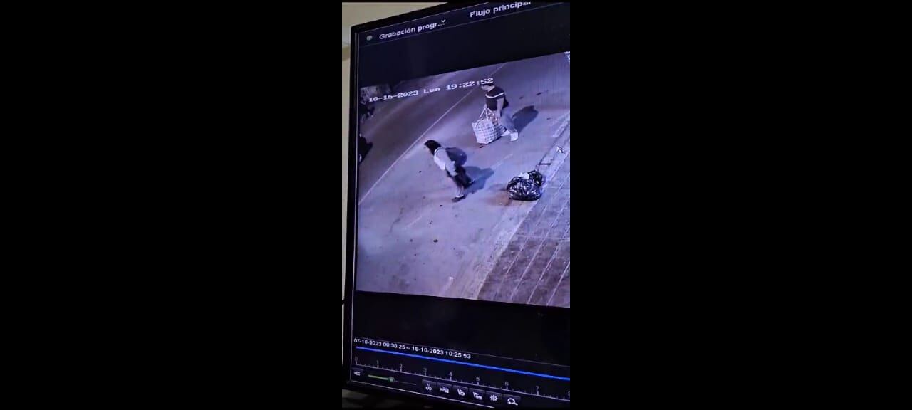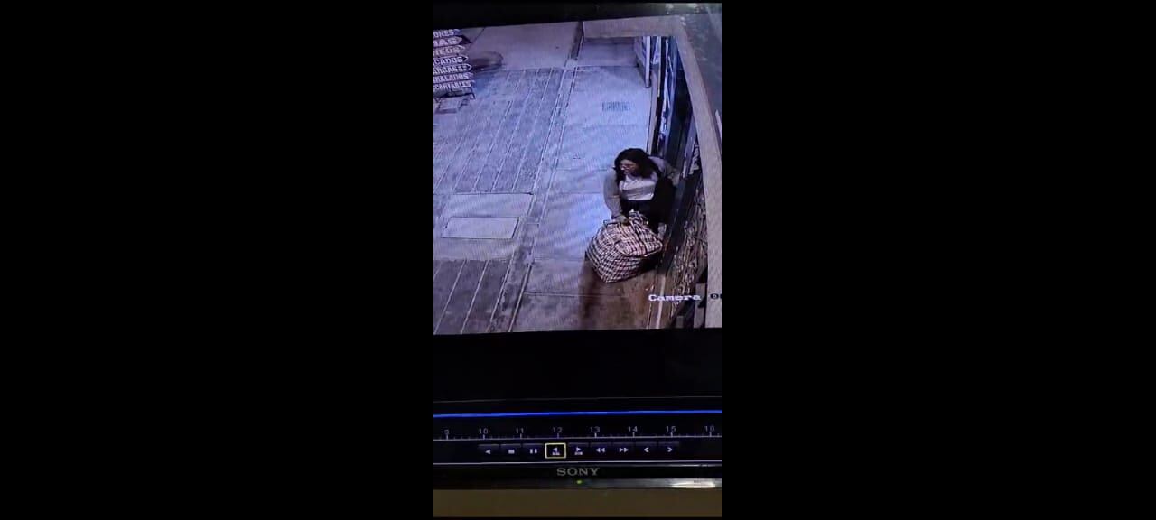 A las 7:21 de la noche se ve a la mujer cuando salió del cuarto con dos paquetes y una mochila. Llegó a la calle y se las entregó a un sujeto que había llegado en un auto negro con letrero de taxi. Ambos se fueron.