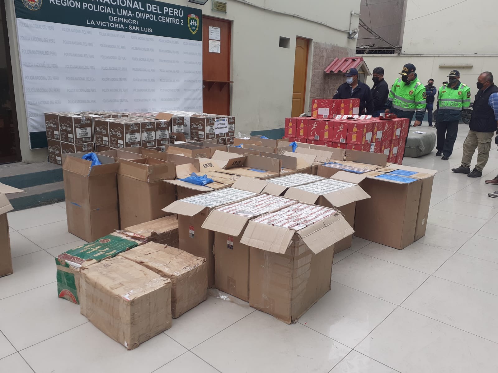 Cajas de licores, cartones de cigarros y fardos de roba de contrabando, que fueron traídos de Tacna y Puno, fueron decomisados por policías de Depincri La Victoria en un camión en el que aparentemente se trasladaba otro tipo de mercadería legal entre avenida Circunvalación y Canadá, en La Victoria.