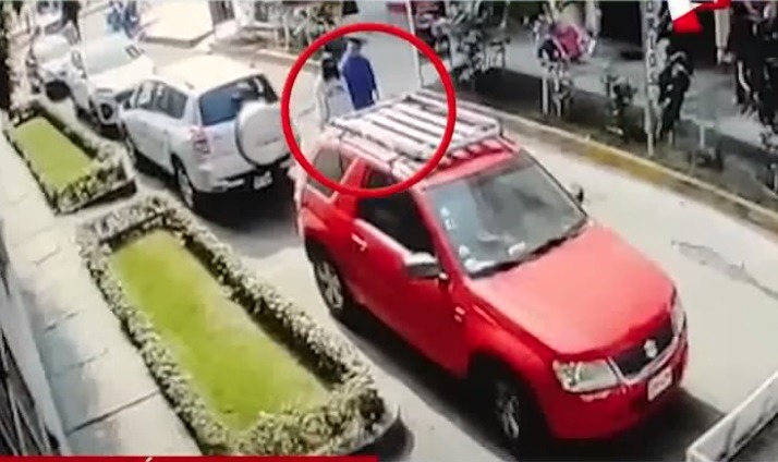 Imágenes difundidas por Latina se puede ver los precisos instantes en los que esta persona, identificada como Adrián Wilfredo Padilla (30), es interceptado por dos delincuentes, que se lo llevan rumbo a una camioneta.