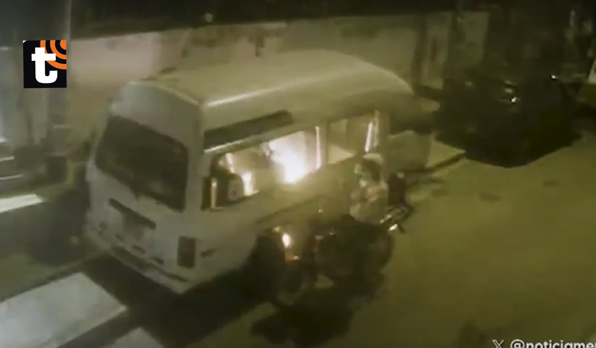 Las grabaciones evidencian que el delincuente llegó a bordo de una motocicleta y se colocó a un costado de la combi. Aprovechando la escasa iluminación, abrió una de las ventanas y arrojó un recipiente con combustible dentro de la unidad.