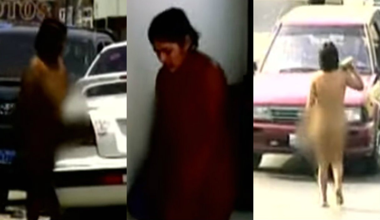 Según se ve en las imágenes de las cámaras de seguridad de una peluquería de la zona, la mujer, completamente desnuda, ingresa y amenaza a la recepcionista con una piedra. Asustada, la trabajadora sale del local y la mujer se sienta detrás del mostrador y comienza a buscar el dinero de las ganancias del día.