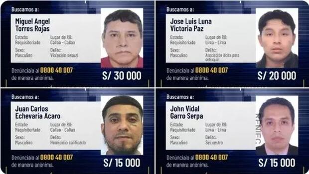 El primero en mención está buscado en el Callao, tras haber cometido el delito de violación sexual, con una recompensa de 30 mil soles por información de su paradero.