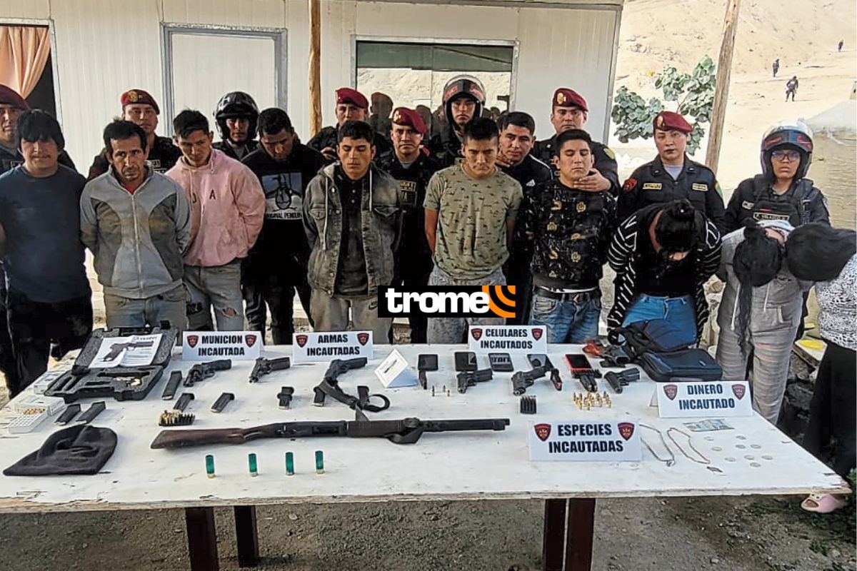 Con una granada ‘mortero’, otra tipo ‘piña’, cinco chalecos de lona con el logo de ‘Policía Diviac’, un chaleco antibalas, pasamontañas, una escopeta, un revólver y cinco pistolas, una de ellas con una cacerina adaptada para 32 municiones, fueron intervenidos 8 varones y 3 mujeres, en un campamento entre cerros, en Pachacámac.