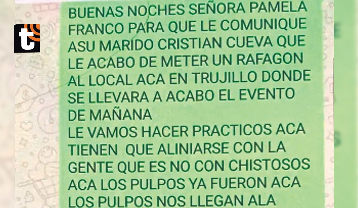 “Señora Pamela Franco, para que le comunique a su marido Christian Cueva que le acabo de meter un rafagón al local acá en Trujillo. Vamos a ser prácticos. Acá tiene que alinearse con la gente, no con chistosos. Acá ‘Los Pulpos’ no llegan. Si hasta antes del evento no me llaman para dar una solución por 50 mil soles, les voy a meter tres granadas y me comenzaré a dejar muertos. Acá la casa tiene dueño”, dice la carta.