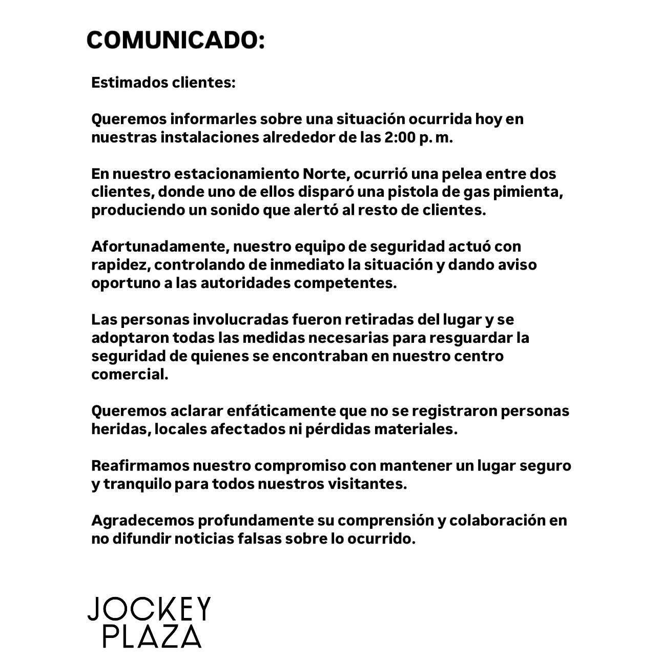 ¡MÁS DATOS! Tras un incidente reportado dentro del Jockey Plaza, el mismo centro comercial lanzó un comunicado donde negaron que una persona haya resultado herida producto del disparo de una pistola de gas pimienta y descartaron que fuera un tiroteo.