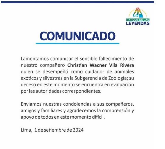 Ante estas acusaciones, Loudmird Gutiérrez, gerente jurídico del Parque de las Leyendas, señaló que la institución no tenía conocimiento de ningún acto de hostigamiento hacia el joven. Agregó que se encuentran colaborando con las investigaciones y brindarán las tomas de seguridad a las autoridades correspondientes.