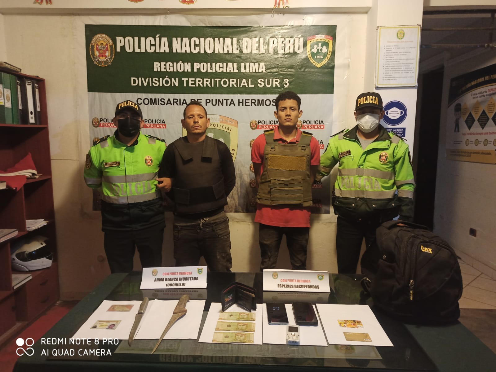 Muy cerca del kilómetro 39 de la panamericana sur, los policías dieron con ambos extranjeros y en una persecución de varias cuadras. Se escondieron en unos matorrales cuando fueron atrapados. Se les identificó como: Carlos Alberto Farfán Rodríguez (41) y Adán Josué Torres Moreno (19), a quienes se les encontró una mochila negra, con los celulares robados, 200 soles y una tarjeta de crédito.