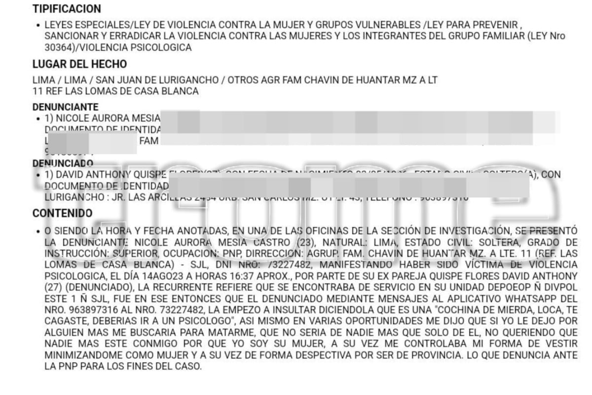 En agosto del 2023, Nicole Mesía Castro denunció haber sido víctima de violencia psicológica por parte de su entonces pareja David Anthony Quispe Flores de 27 años, quien la insultaba y la amenazó de muerte en más de una oportunidad, según el testimonio de la agente.