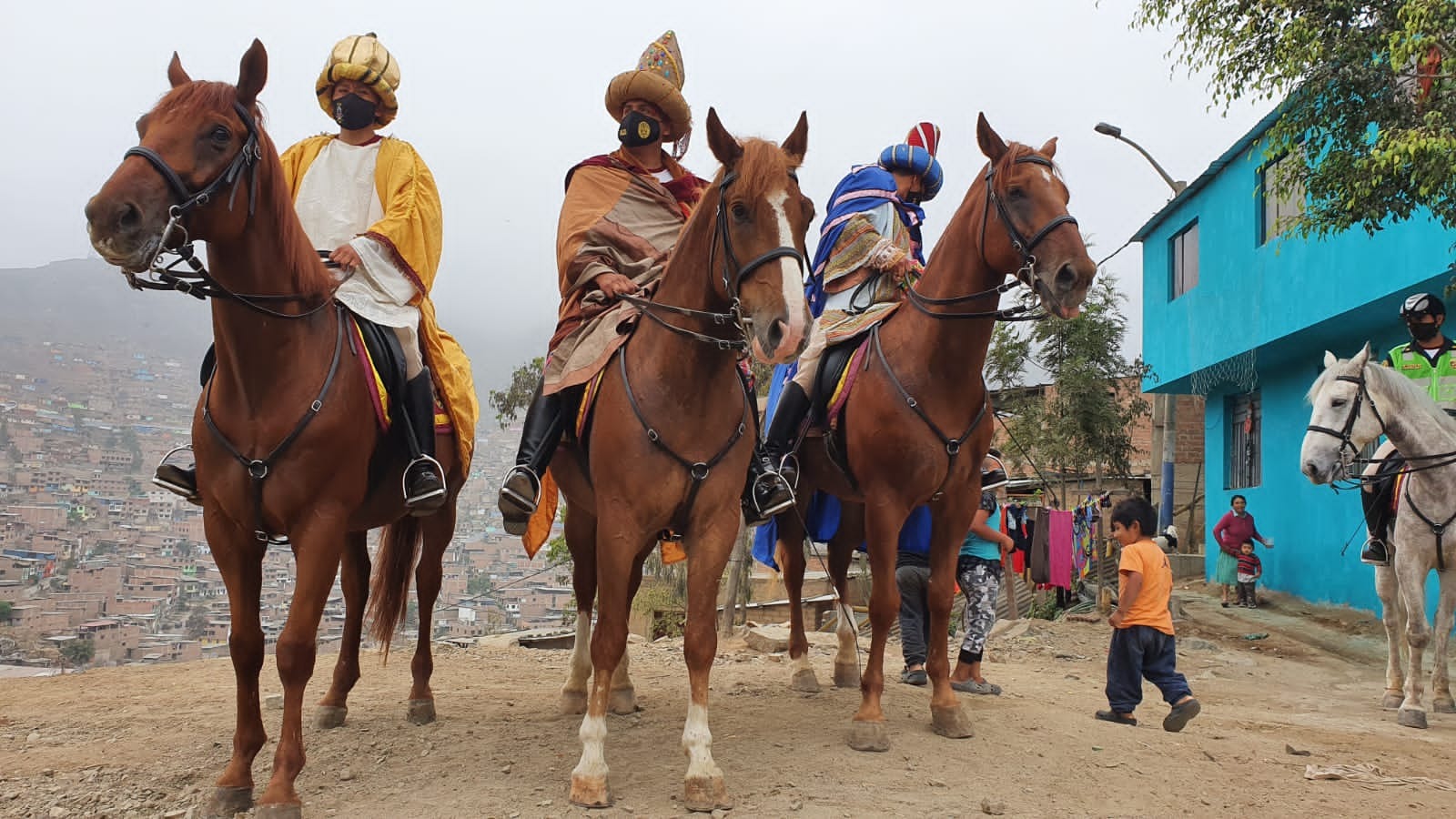 Policías, caracterizados en los reyes magos Melchor, Gaspar y Baltasar, y en Papá Noel, montados en caballos, llevaron esta tarde alegría y regalos a niños, mujeres y ancianos de diferentes asentamientos humanos en el distrito del Rímac por Navidad.