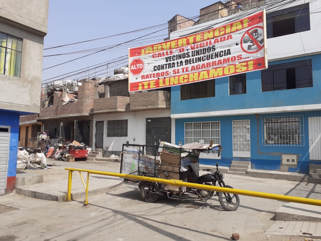 Cansados de ser víctimas de la delincuencia y que las autoridades les den la espalda, un grupo de vecinos de la cooperativa de vivienda Santa María, en San Juan de Lurigancho se han organizado y han amenazado con linchar a los asaltantes ‘raqueteros’ con un cartel con la frase “Ratero si te agarramos, te linchamos”. Esto como medida para frenar la ola de atracos a mano armada que se registran todos los días.